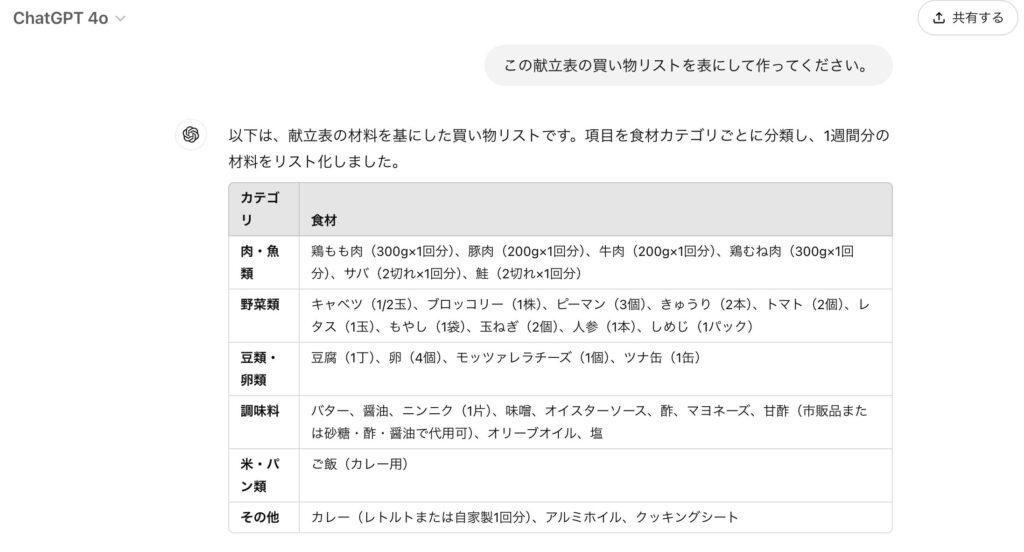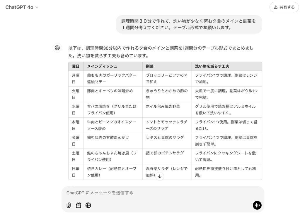 でも、AIに頼ると、たとえば「献立を一週間分考えて」なんてお題もあっという間に解決します。