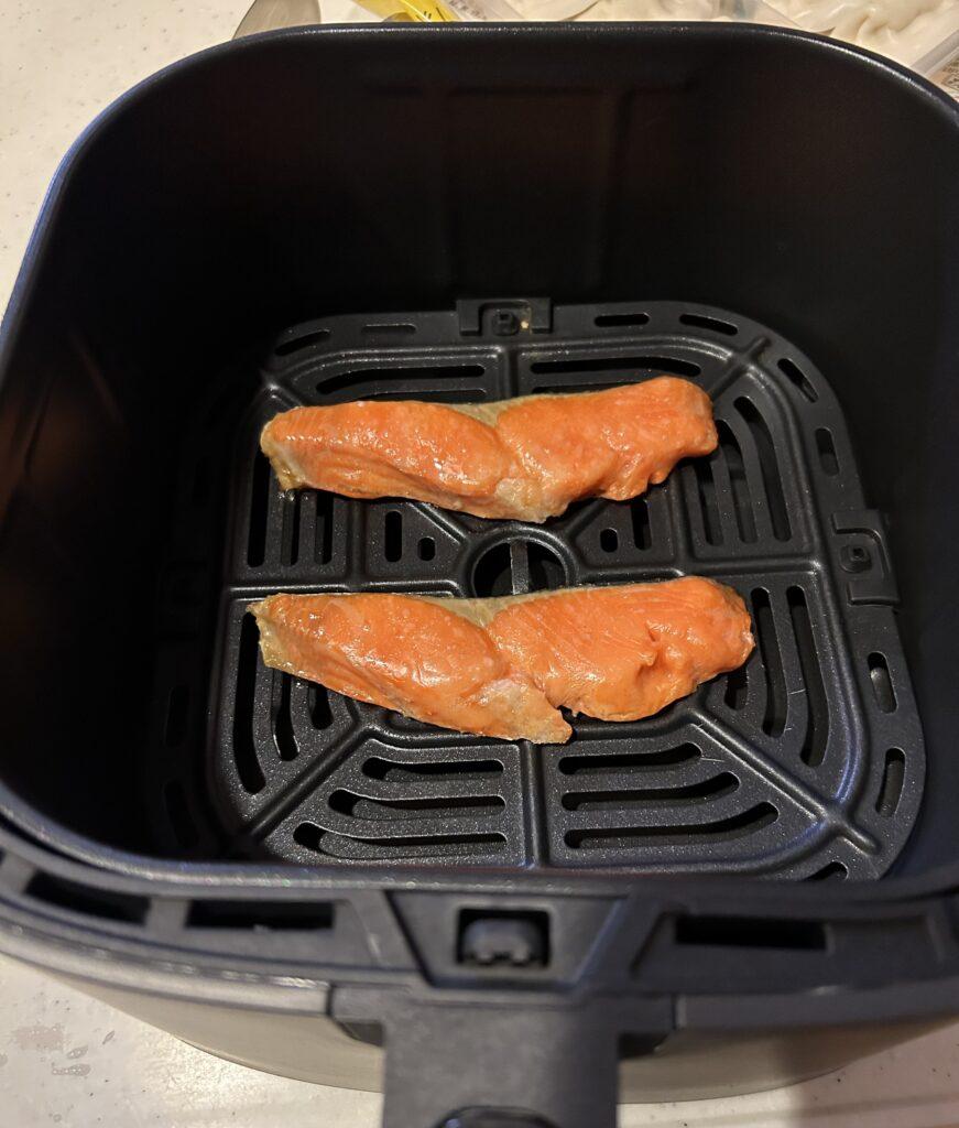 予熱が終わり、鮭の準備ができたら、エアフライヤーのバスケットに鮭を入れていきます。